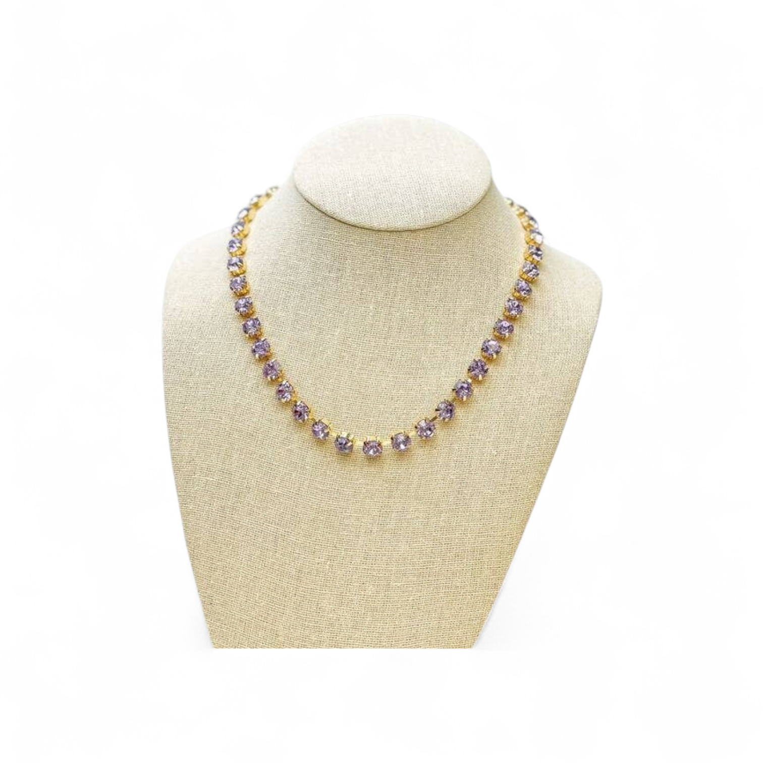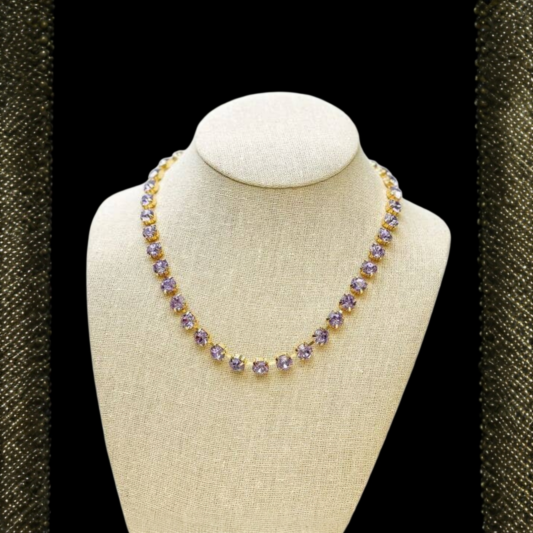 This shimmering Gemstone Necklace in Lavender is a stunning addition to any wardrobe. Its brilliant stones catch the light, making it the perfect accessory for any occasion. With its delicate design and eye-catching shimmer, this necklace is sure to become a favorite in your jewelry collection.