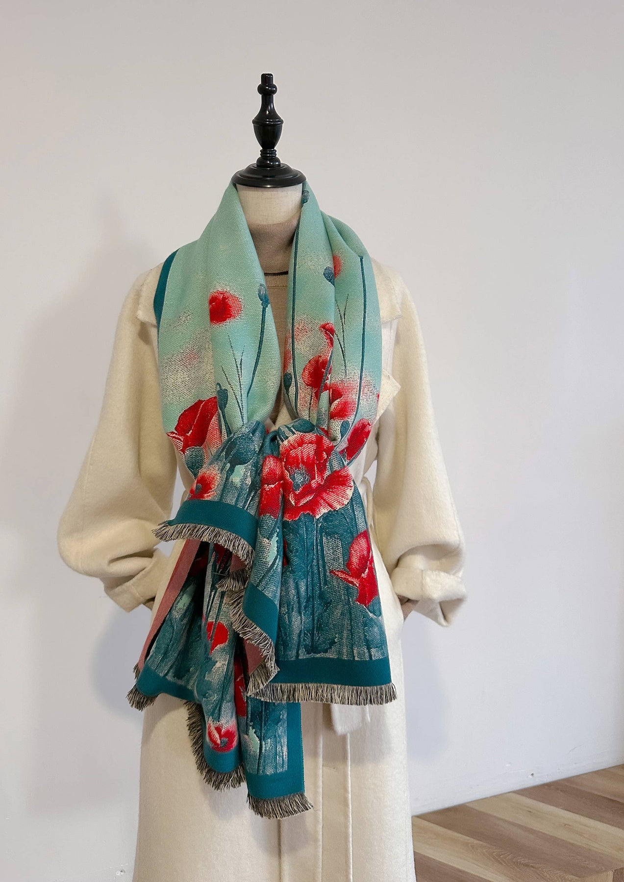 This one size fits all reversible wrap, drapes over and accents any outfit, casual or dressy. It feels and looks like cashmere. A beautiful layering piece! 55% Poly, 45% Viscose.